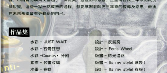 2008年陽明海運第二屆國際兒童繪畫比賽入選獎 97年度第62屆站車秩序暨平交道安全宣導壁報比賽第三名 98學年度全國學生美展比賽花蓮縣初賽獲版畫類國中美術班組第三名