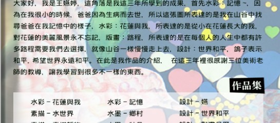 花蓮第一信用合作社慶祝九十之年慶舉辦「發現故鄉之美」兒童繪畫比賽國中組 佳作 九十六年學年度第學期年及奈米創意秀才藝比賽第一名 遠東百貨「米老鼠創意繪畫比賽」國中組第二名 花蓮縣消防局家庭逃生計畫圖比賽國中組第三名 國際師子會300F和平海報競賽佳作 97年畫我『林田山林業文化園區』及『池南國家森林遊樂區』比賽國中組佳作 『九十年花蓮縣議會議長盃洄瀾之美寫生比賽』國中組 第一名 『池南國家森林遊樂區—夏艷生態之美』比賽國中組佳作 文蘭國小曾辦縱谷國家風景區寫生比賽國中組佳作 2008年「陽明海運文化藝術獎」第二屆兒童繪畫比賽現場寫生類國中組優選 98年元宵節彩繪獲燈籠比賽國中組第二名 花蓮縣餅與麥式多歐式麵包主辦之「印象花蓮」以獎徵圖比賽國中組佳作 九十七年學年度營養午餐教育美術班繪畫類八年級組 第一名 九十八年第一學期九年級組生涯檔案佳作