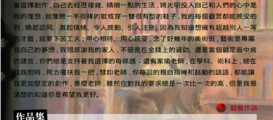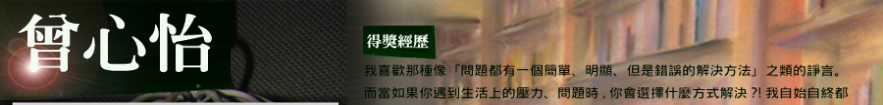 全國學生美術比賽花蓮縣初賽(98.10.21)漫畫類國中美術班組-第二名 全國學生美術比賽花蓮縣初賽(98.10.21)水墨類國中美術班組-第三名 全國學生美術比賽花蓮縣初賽(98.10.21)版畫類國中美術班組-佳作 花蓮縣立國風國民中學生涯發展教育檔案評比(98.1.19)八年級-第一名 第十八屆維他露兒童美術獎(97.9.21)國中組-入選 花蓮縣立國風國民中學奈米創意秀比賽(97.1.7)七年級-第一名